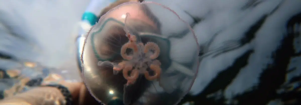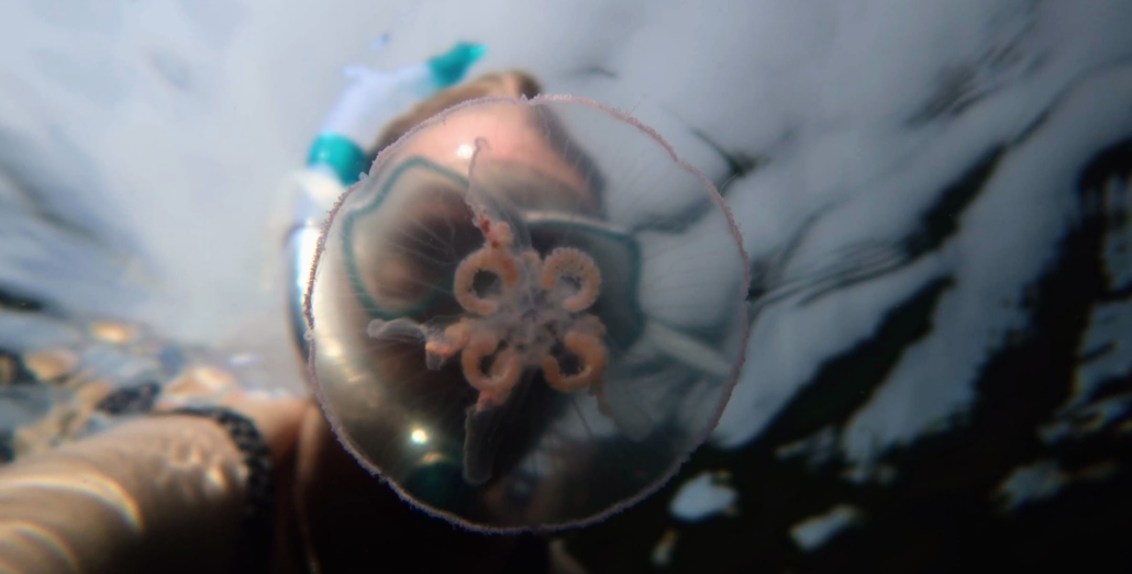 Meduusoja katsellessani mietin, miten ne mahtavat aistia läsnäoloni. Ne tuskin näkevät minua tai kuulevat hengitystäni, mutta ehkäpä ne aistivat veden liikkeistä tai vaikkapa lämpötilasta, että lähellä liikkuu jokin iso ja lämmin olento?