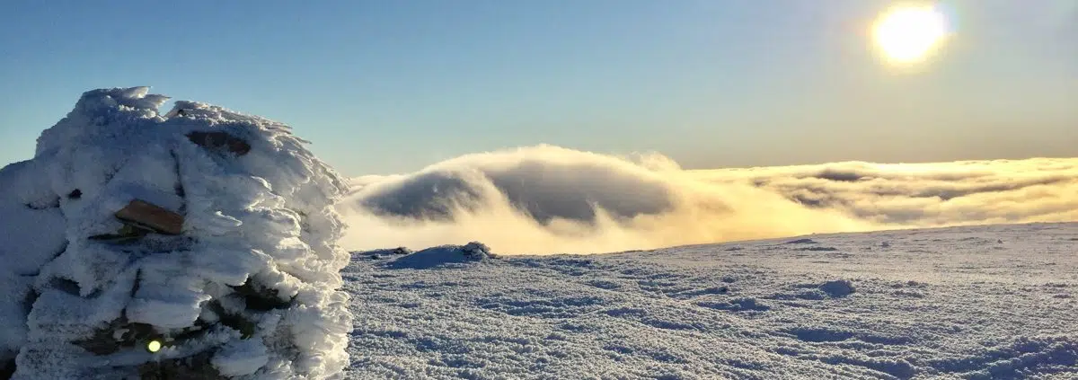 Pirunkurun pitkä nousu ja paikoin jyrkkienkin kohtien kipuaminen lumikengillä sujui yllättävän hyvin, kun kivikko oli lumen peitossa ja kantapääraudat nostettu ylös. Olipas upeat näkymät taas matkan edetessä. Alhaalla oli usvapilveä ja ylempänä kuuraisia puita, valkoisia rinteitä ja sininen taivas.