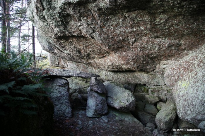 Kun olin päässyt jyrkänteen puolivälissä olevalle portaalle, vilkaisin alas. Vasta sieltä saattoi hahmottaa kunnolla alhaalla olleen kiviviidakon mittasuhteet – siellä olivat valtavat lohkareet, joiden alla oli toinen maailma, jossa ei kovin moni ihminen ollut käynyt. Luultavasti samoin oli tuolta tasanteelta löytyneen luolan laita se oli noin 10 metrinen, tilava rakoluola, jonka lyhempi haara oli jonkin matkaa kiivettävissä. Alempiin luoliin nähden suurin ero oli luolan sisältä löytyneet pyöreät kivet, joita alempaa oli turha hakea.