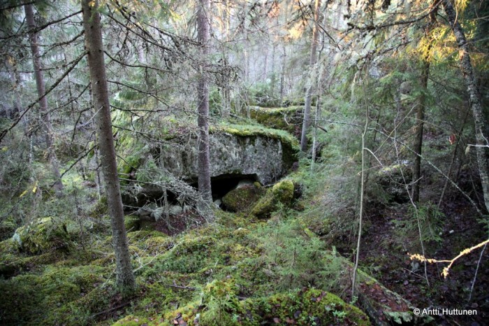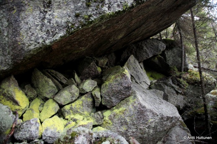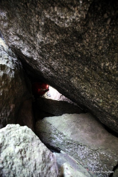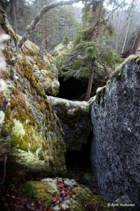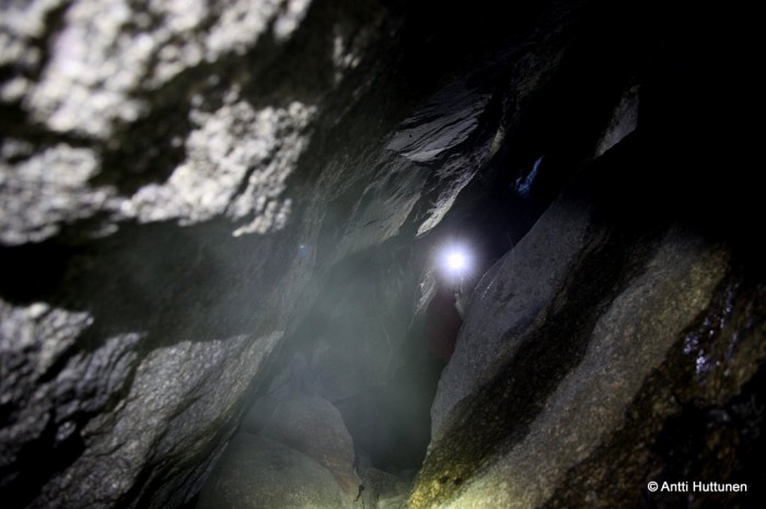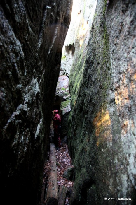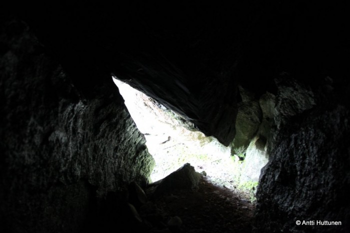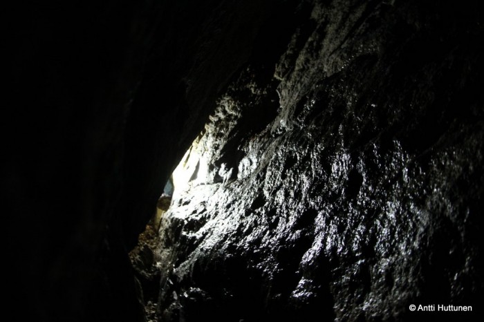 Vastaus odotti kymmenen metrin päässä, siinä kohtaa missä rotkon pohjalta olisi alkanut kipuaminen kohti vuoren lakea. Kun katseen käänsi vasemmalle, pohjoisen suuntaan, loksahti suu auki. Ei siinä ollut vain luola, vaan Suomen mittakaavassa jotain aivan uskomatonta. Edessä jatkui kymmeniä metrejä pitkä kallion rakoillessa muodostunut käytävä, johon kävi vain pieni valonkajo suuaukosta.