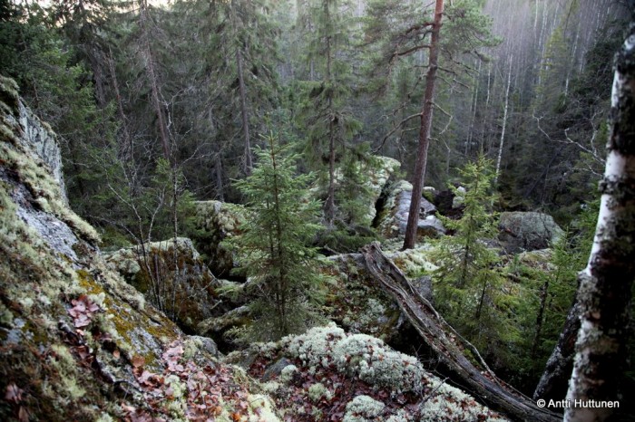 Siinä kohtaa pysähdyin pohtimaan paikan ainutlaatuisuutta. Jyrkkä vuorenrinne, valtavat lohkareet ja viereinen suo olivat eristivät sen tehokkaasti muusta maailmasta. Samaan aikaan oli hämmentävää, että Isojärven kansallispuiston raja kulki vain 250 metrin päässä luoteessa. Tämä upea paikka jäi sen ulkopuolelle ja ehkäpä samasta syystä monelta kulkijalta oli jäänyt tänne poikkeamatta, varsinkin kun reitit eivät tuoneet lähelle, eikä paikasta löydy mainintaa käytännössä mistään.
