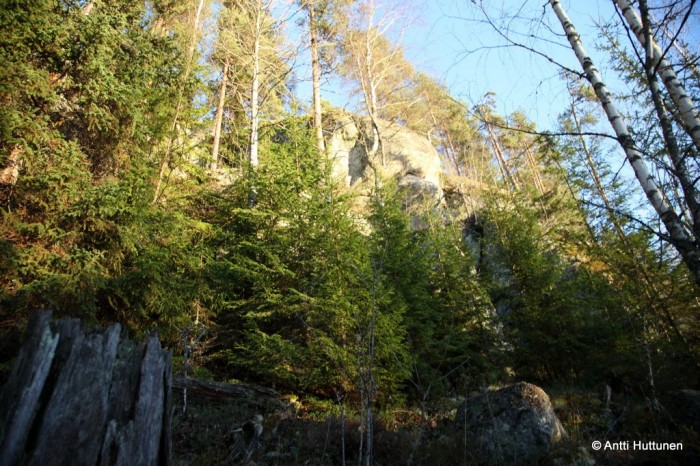 Jossain kohtaa vuoren laella nuori männikkö vaihtuu harvempaan varttuneeseen puustoon, josta muutaman kymmenen metrin päästä näkyi enää vain latvustoa. Marraskuisen iltapäivän aurinko lämmitti lempeästi ja loitompana avautui komea maisema. Notkonpohjalla oli komea kosteikko, jota ajattelin käydä vilkaisemassa alas päästyäni. Aivan kallion juurella puolestaan oli vierivieressä suuria kiviä – joista kartta ei myöskään maininnut.