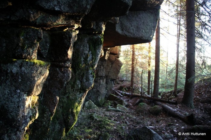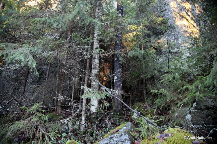 Sen perästä jyrkänteen juurella oli hyvin tunnelmallinen lippaluola, johon matalalta paistanut aurinko loi harvoja, mutta lämpimi säteitään. Siihen olisi voinut jäädä istuskelemaan ja nauttimaan paikan tunnelmasta, vaan eipä malttanut. Samoihin aikoihin edestä kuului Elinan huudahdus: ”Täällä! Nyt löytyi!”
