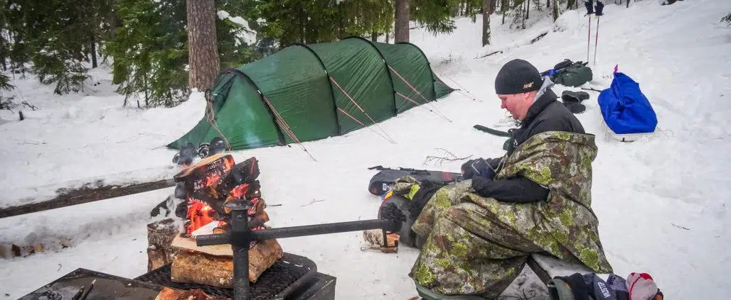 Minä halusin Lapin keikkaa ajatellen treenata talvitelttailua ja ryhdyin siksi heti katselemaan paikkaa pitkälle Hilleberg Kaitum 2 GT -tunneliteltalleni, sekä pystyttämään sitä. Vaikka hyvä paikka löytyi heti aika läheltä nuotiopiiriä, oli teltan pystyttäminen jotenkin kuin tervanjuontia, edeten tavattoman hitaasti. Vasta paljon myöhemmin, eväitä nuotion ääressä syödessäni tajusin sen johtuneen turhan matalasta energiatasosta pitkän päivän jälkeen.