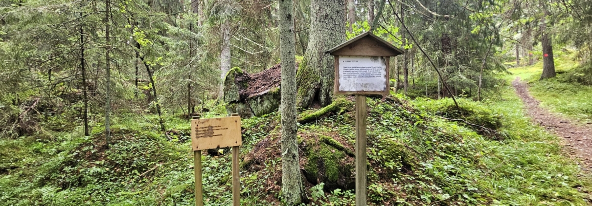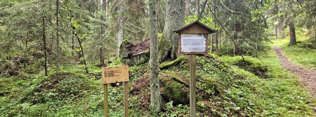 Reitti ylittää hiekkatien ja käy pohjoisimmassa pisteessään. Tästä sukelletaan tunnelmalliseen aarnimetsään, jossa oli jo paljon mukavampi kävellä. Blogin pääkuva on otettu kohdassa, jossa oli melko paljon vanhoja opastauluja. Yksi kertoo kuusesta ja toinen puiden pituudesta. Molemmissa on muuten numero 6 – mahtaako tieto 15 opastaulusta koskea vanerisia tauluja vai tulostettuja opastauluja.