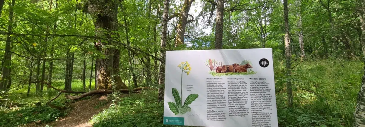 Vaisakon kukkaloisto saattaisi olla parhaimmillaan touko-kesäkuussa. Taulu kertoo myös, että täällä pyritään edistämään kukkaloistoa muun muassa kuusia poistamalla.