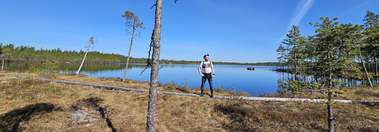 Seuraavalla osuudella, järven luoteiskulmassa, onnistuin kävelemään hieman harhaan. Rannan tuntumassa kulkenut polku vei kivaan suomaisemaan, mutta samalla huomasin reittimerkintöjen kadonneen. Kurkkasin Karttaselain-sovellusta ja totesin olevani muutaman kymmenen metriä pois polulla. Matalassa taimikossa oli helppo harppoa takaisin polulle – tosin kuljin kerran sen yli huomaamatta sitä. Vasta toisella yrittämällä päädyin oikealle reitille. Harhailu kesti tuskin minuuttiakaan. Polku jatkuu mäntytaimikossa, hieman kauempana järven rannasta.