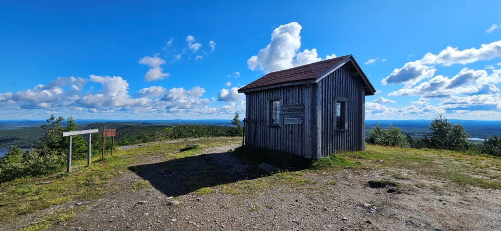 Huipulla on vanha palovartijan maja, nykyisin käytössä päivätupana. Käväisin kirjoittamassa nimen vieraskirjaan. Majan seinässä on paras Valtavaaran huiputuksen reittikartta. Ottamastani kuvasta tarkistin reittiä hieman myöhemmin.