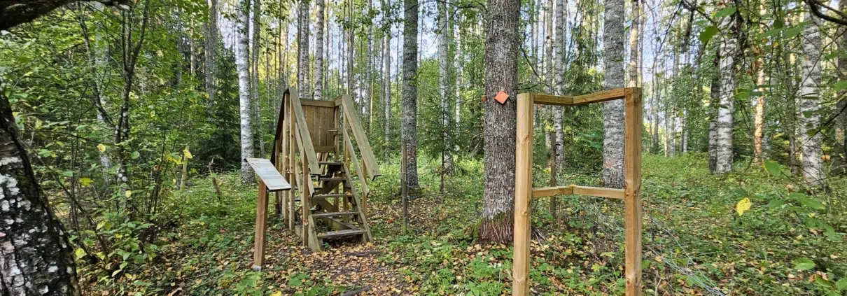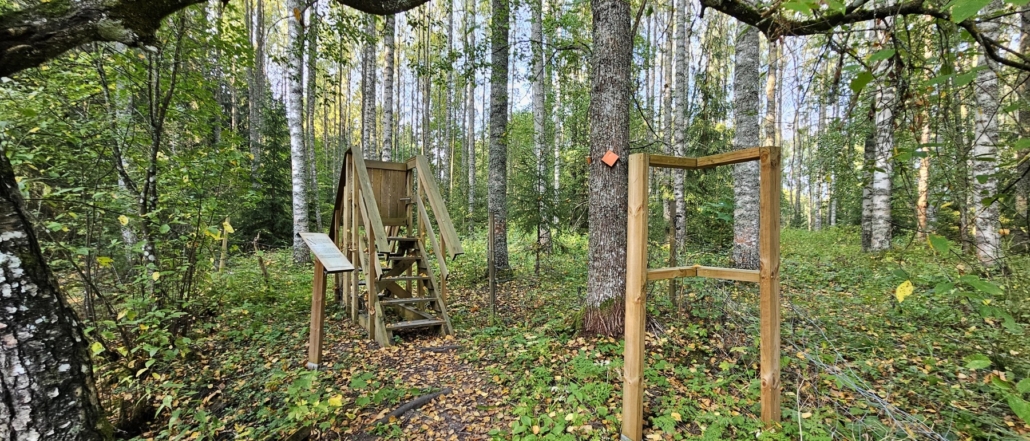 Ihmettelin kovasti puisia kehyksiä reitin varrella. Luulin, että reitille oli tulossa uusia luontotauluja ja niiden info puuttui vielä kehyksistä. Vasta tätä kirjoitellessani huomasin, että asiaan löytyy ratkaisu Huittisten nettisivulla. Satuseikkailun taulujen läheisyydessä on kehyksiä, jotka toimivat raameina sadun kuville. Ahaa!