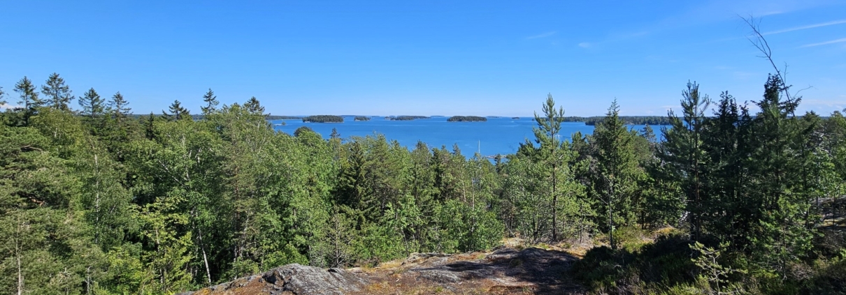 Maisema avautuu kohti itää ja kaakkoa, jossa on jokunen pienehkö saari näkyvissä. Tästä ei myöskään ole pitkä matka Vuosaaren Ramsinniemeen, joka taisikin kuvassa vasemmalla olevien puiden takaa hieman häämöttää. Mukava kävelyreitti (joskaan ei ihan luontopolku) sielläkin tarjolla.