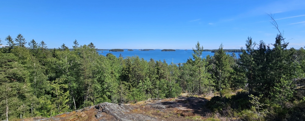 Maisema avautuu kohti itää ja kaakkoa, jossa on jokunen pienehkö saari näkyvissä. Tästä ei myöskään ole pitkä matka Vuosaaren Ramsinniemeen, joka taisikin kuvassa vasemmalla olevien puiden takaa hieman häämöttää. Mukava kävelyreitti (joskaan ei ihan luontopolku) sielläkin tarjolla.