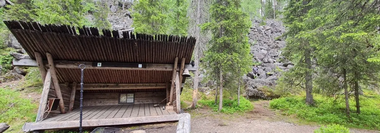 Kuru on noin parisataa metriä pitkä ja kapenee länteen päin kulkiessa (joka on siis tässä luontopolun suunta). Taukopaikka laavuineen on puolivälissä kurua. Paikka on hieno, mutta kuvissa kurua ei saa oikein näkyviin. Kivikkoiset rinteet jäävät jonkin verran puiden taakse piiloon. Blogin pääkuvassa Luontopolkumies seisoo kivikossa laavun takana, mutta harmaa paita ei sekään oikein näy kivikosta. Melkoinen piilokuva. Pidimme taukoa laavulla. Jokin lintu lauleli toistuvasti samaa melko lyhyttä säettä. Tuntematon ääni – yritin hyödyntää puhelimen sovellusta, mutta kenttää ei tainnut olla tarpeeksi, joten lintu jäi selvittämättä. Vasta majapaikassa myöhemmin jatkoin äänen tunnistusta ja lintu osoittautui sinipyrstöksi. Harmillista – olisimme varmasti yrittäneet kiikaroida tätä melko harvinaista lintua, mikäli olisimme tienneet, mistä linnusta oli kyse.