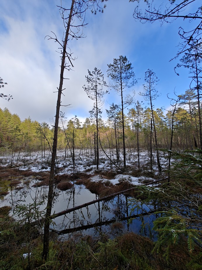 Nousin kallioiselle mäelle. Taakseni oli jäänyt varjoisa ja vihreä kuusikonnotko hiekkapohjaisine, tummine puroineen, ja jyrkän nousun jälkeen olin täytenä yllätyksenä saapunut lumen ja auringon maahan. Varovainen lumikerros oli kukkulan laella peittänyt alleen loputtomat jäkälämatot sekä kallionkoloihin jäätyneiden lampien pinnat. Kelot, lahopuut ja muu vanha puusto yhdessä lumikerroksen kanssa kylpivät auringonvalossa, joka aivan yllätyksenä osui juuri tähän hetkeen – mikä mainio tuuri muutoin pilvisen päivän keskellä.