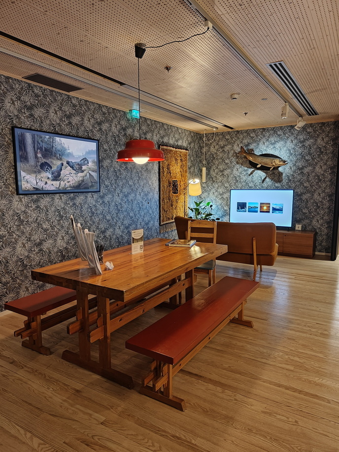 Talvipäivän jälkeen – tai sen lomassa – on ihanaa päästä lämmittelemään. Haltian olohuone on kaikille vierailijoille avoin, viihtyisä tila, jossa voi istahtaa alas ja antaa mukavan raukeuden vallata kehon reippaan ulkoilun jälkeen. Voit selailla kirjoja tai vaikka somettaa retkikuviasi, ja lapsillekin löytyy pientä mieluisaa puuhaa. Kerrosta ylempänä Ravintola Haltia tarjoilee ruokaa, kahvia ja herkkuja.
