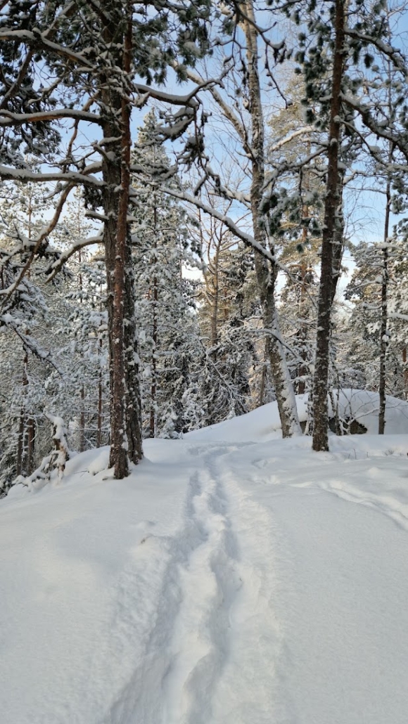 — Lunta ei ole niin paljon, etteikö voisi hieman poiketa merkityltä reitiltä. Maa on jäässä lumen alla, niin siinä on melko helppo kävellä, kunhan varoo liukkautta. Lumi on kevyttä puuterilunta, sen lomassa kävely ei ole lainkaan raskasta. Todella helpolla pääsee omaan pieneen rauhaan lumen keskellä, sanoo Maarit.