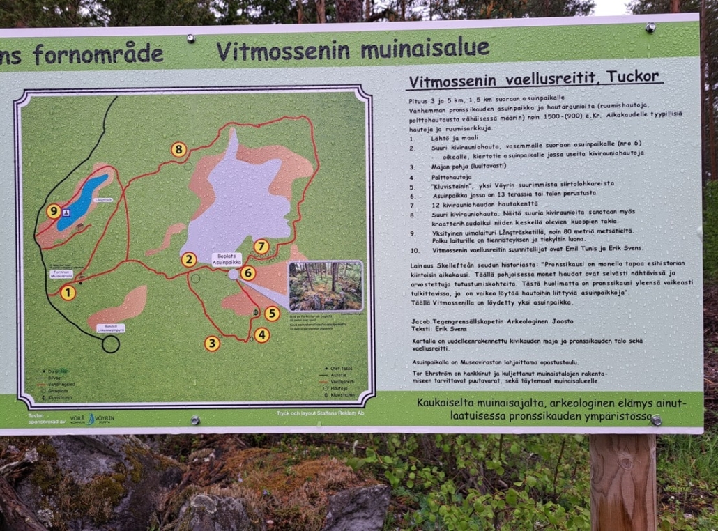 Vitmossenissa on yksi vanhimmista löydetyistä asuinpaikoista Suomessa vanhemmalta pronssiajalta. Suorinta reittiä asuinpaikalle on matkaa 1,5 km, joten jos tulee samoja jälkiä takaisin, käveltävää kertyy 3 km. Rengasreitin pituudeksi ilmoitetaan 5 km.