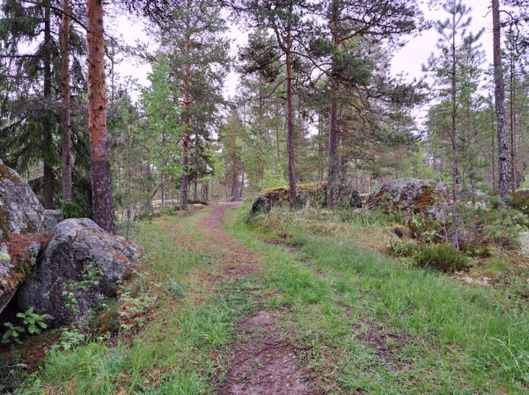 Tämän jälkeen polku kapenee, mutta erottuu koko ajan selkeästi. Alkumatkasta kuljetaan jäkäläpeitteisellä kalliolla ja sitten sukelletaan metsään.