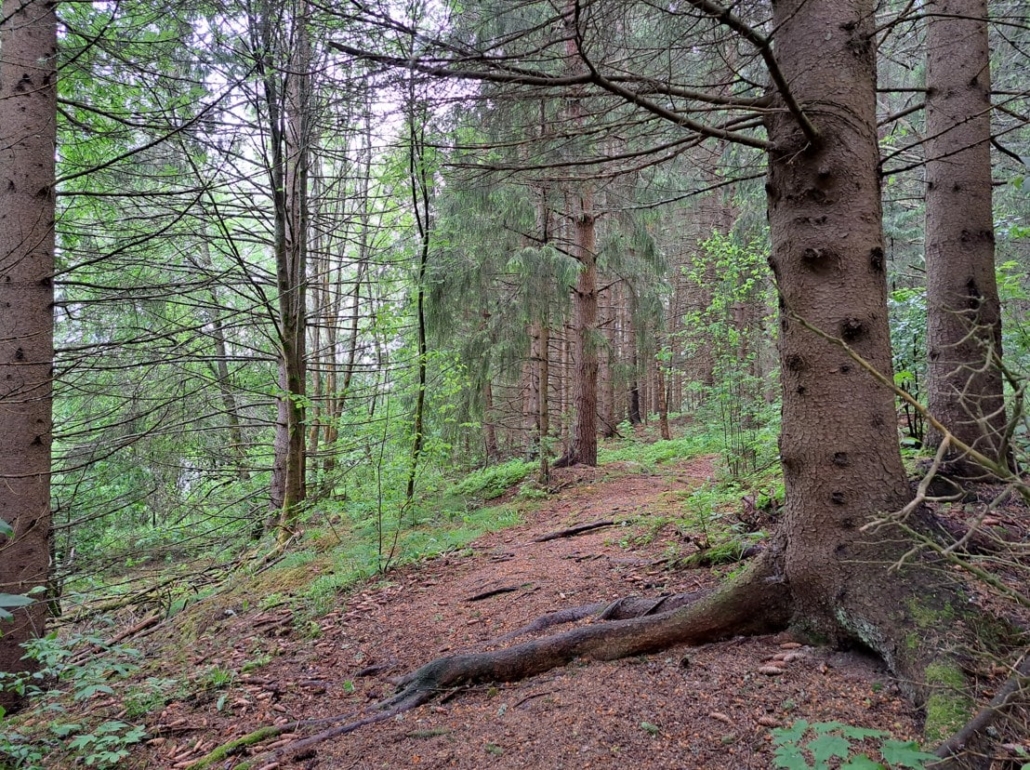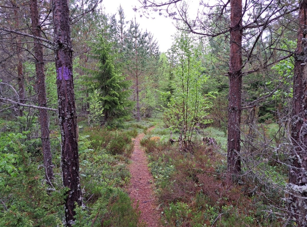 Sateesta kostea, neulasilla päällystetty punertava polku mutkittelee somasti alkukesän vihreyttä hehkuvan varvikon keskellä.
