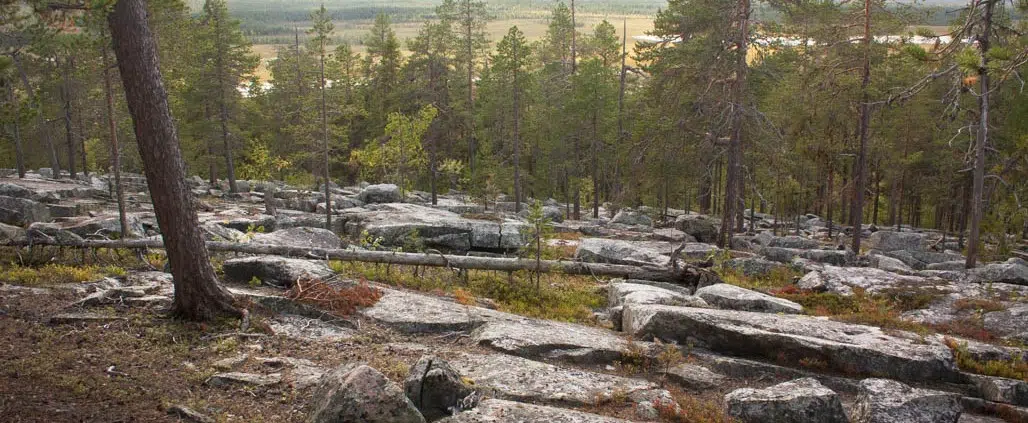 Kuin veitsellä leikaten mustikkamättäät muuttuivat louhikoksi. Kivet eivät olleet pienen pieniä, eivätkä suuren suuria. Mutta monet olivat selviä komeita laattoja, kauniin läikikkään jäkälän koristelemia. Keloja lepäsi siellä täällä poikittain kivilaattojen joukossa.
