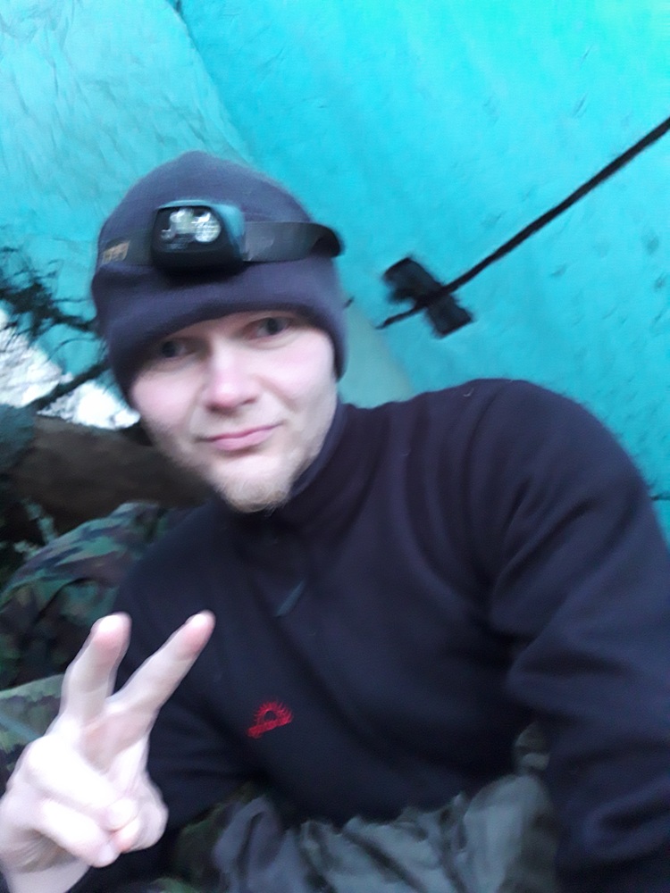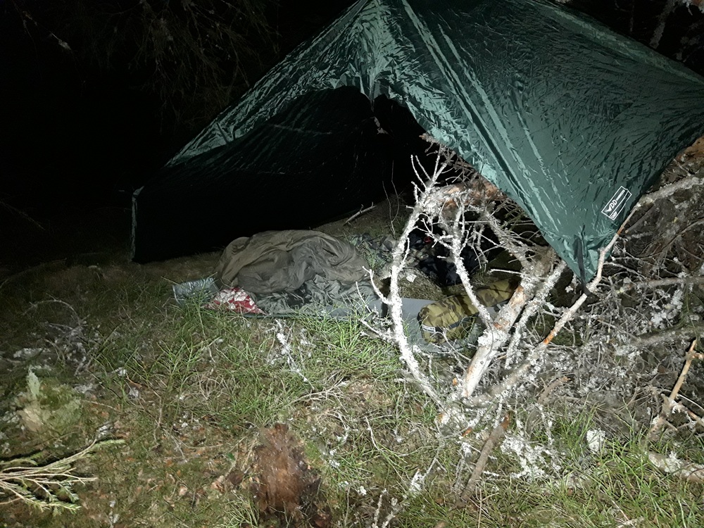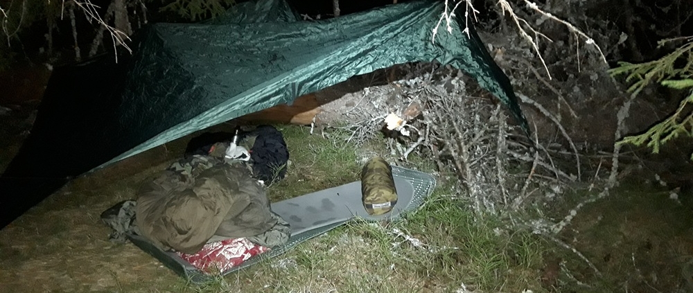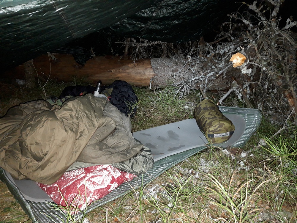 – Löysin sopivan paikan kahden talven kaataman puunrungon läheltä. Rungot tarjosivat sekä hieman tuulensuojaa että sopivia oksia tarpin virittelyä varten, Kaarne kertoo.