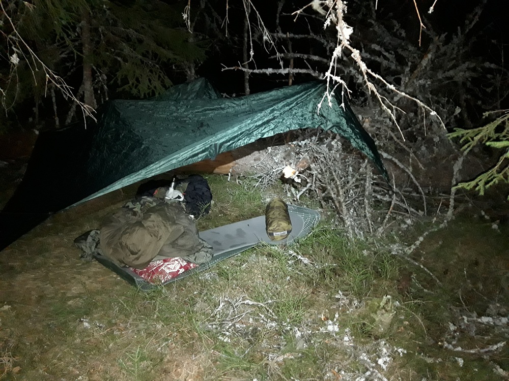 – Halusin kokeilla mahdollisimman minimaalista majoittumista, ja käytännössä siis virittelin vain tarpin makuusijaksi valikoituneen maapuun oksien varaan. Nukuin kahdella makuualustalla salaisen aseeni eli fjelldukenin suojassa, Kaarne paljastaa.