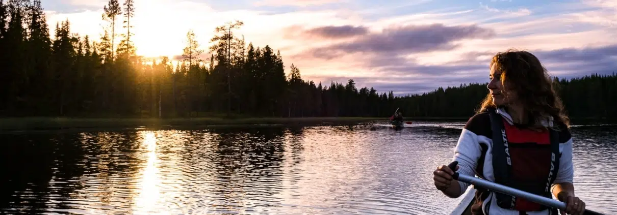 Yöjunan hytistä Itä-Lapin rauhaan – melontaretki auringonlaskun aikaan Sallan villirantaisella Hangasjärvellä
